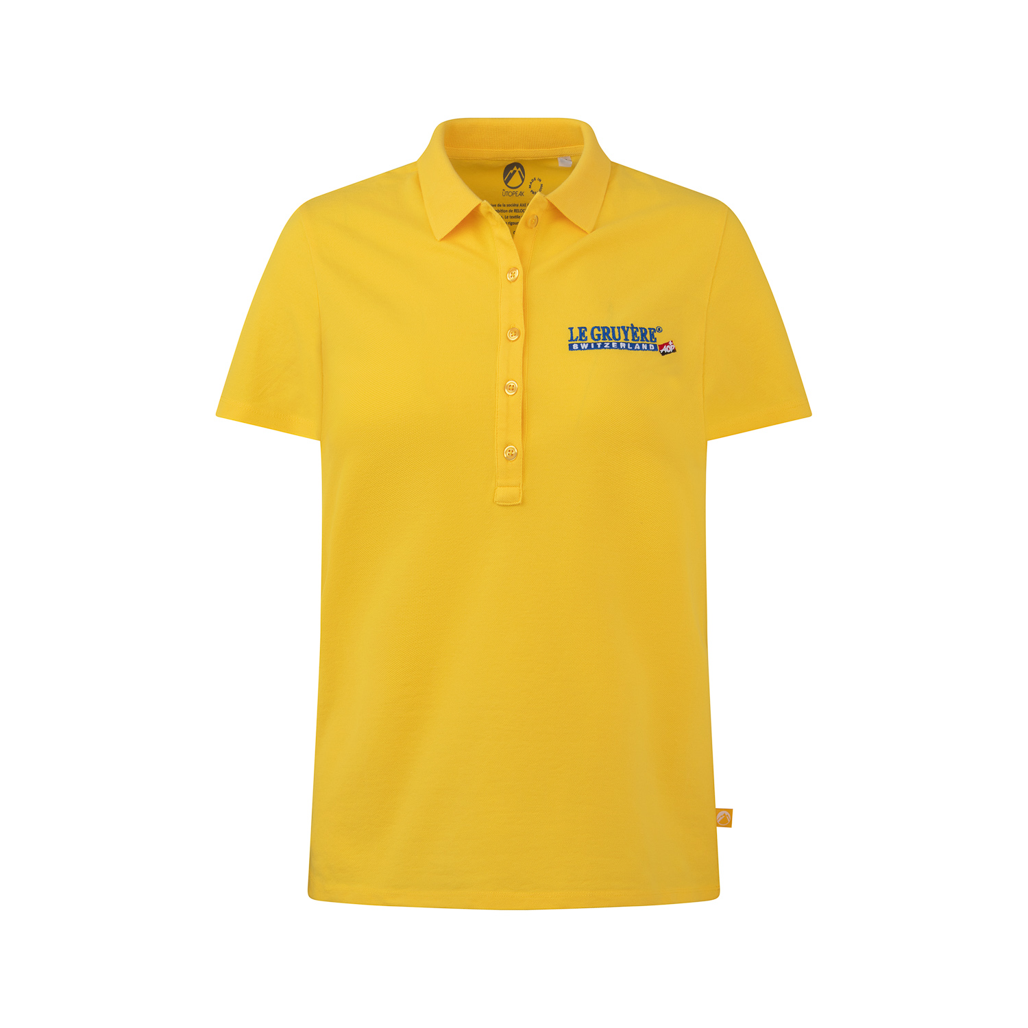 Women's yellow cotton polo shirt with Le Gruyère AOP logo embroidered on the front and back, made in Europe.