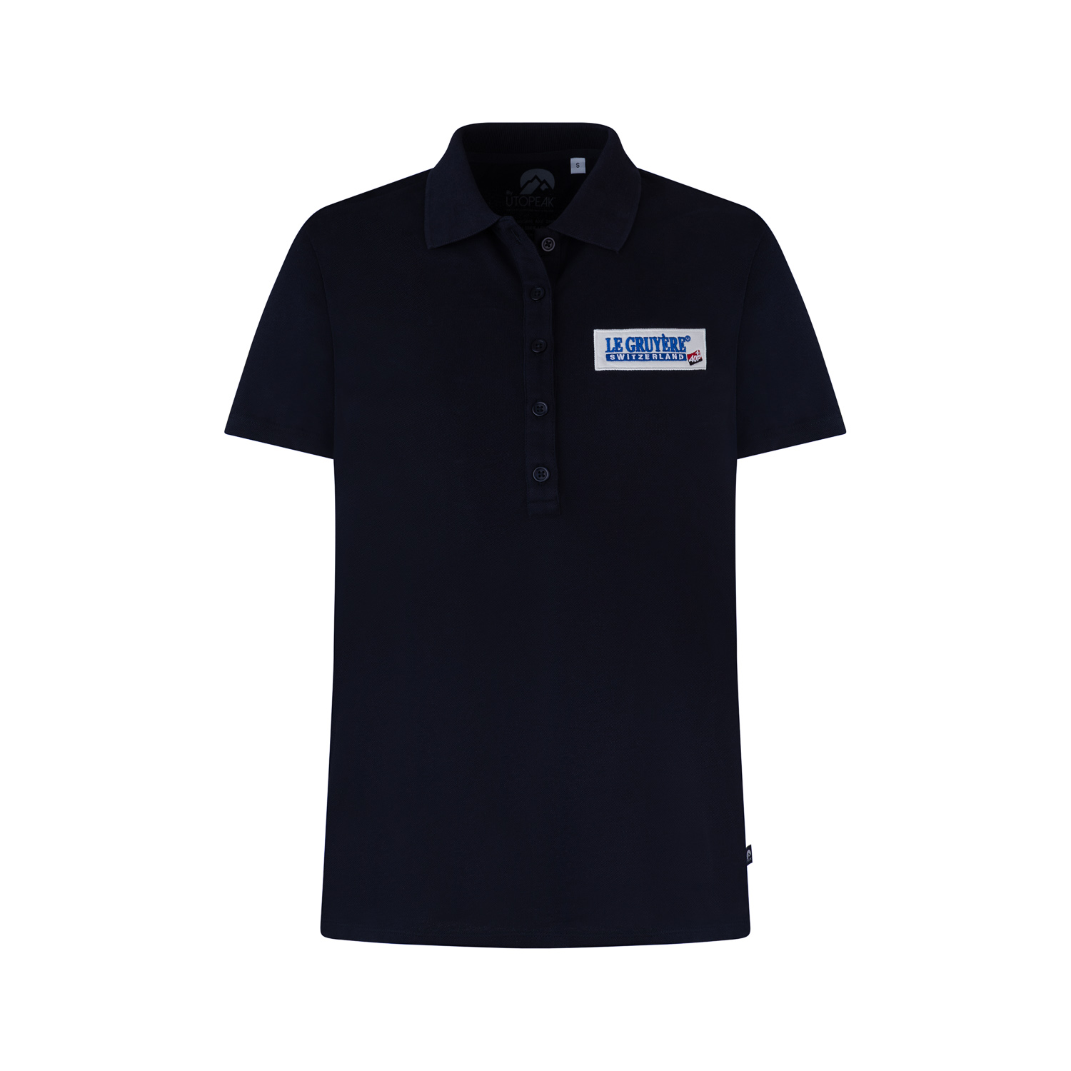 Polo en coton pour femme, de couleur bleu, avec le logo Le Gruyère AOP, article fabriqué en Europe.