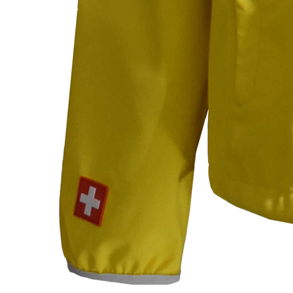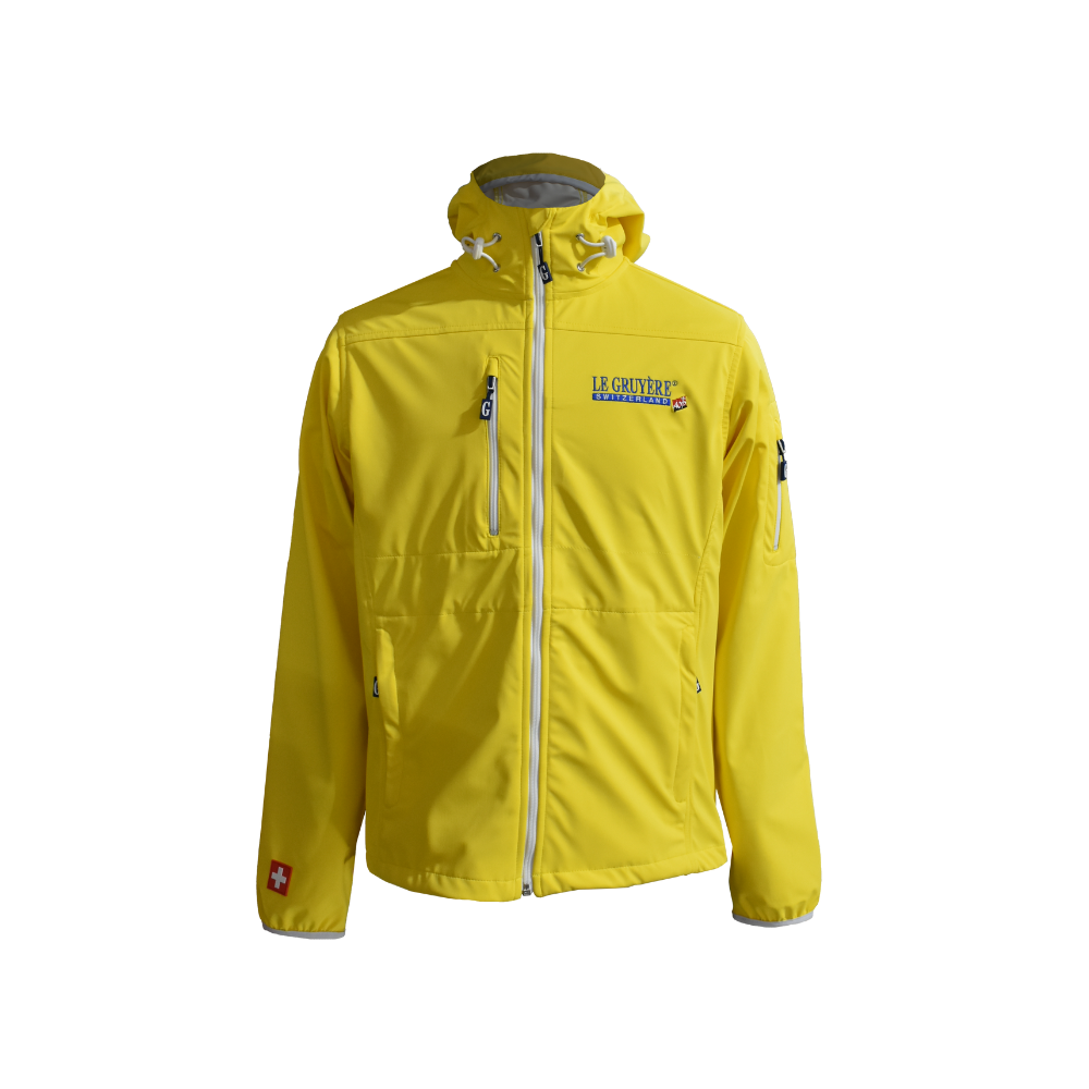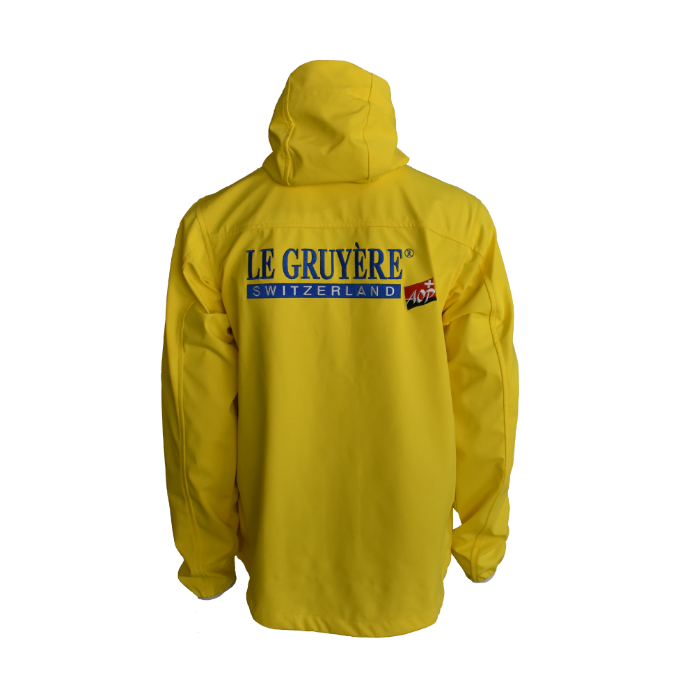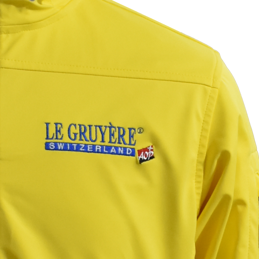 Veste softshell jaune avec logo La Gruyère à l’avant et à l’arrière, ainsi que le drapeau suisse sur la manche droite
